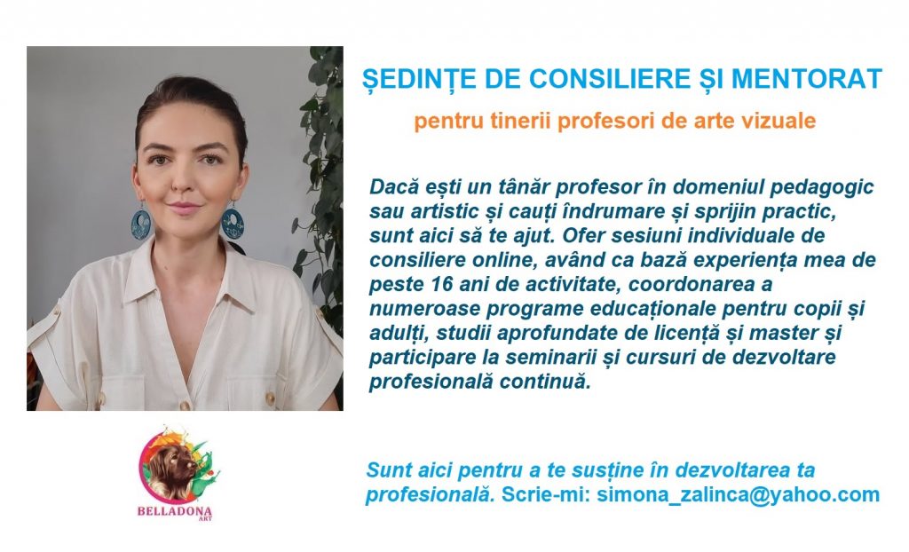 Descoperă lumea artei alături de Atelierul BELLADONA ART! Instituție de învățământ cultural în domeniul artelor plastice, dedicată atât copiilor, cât și adulților, programele educaționale sunt concepute și susținute de un mentor și profesor dedicat. Cu experiență vastă în domeniul educației și al artelor, am creat un mediu captivant în care copiii își pot dezvolta în mod armonios și personal abilitățile artistice.